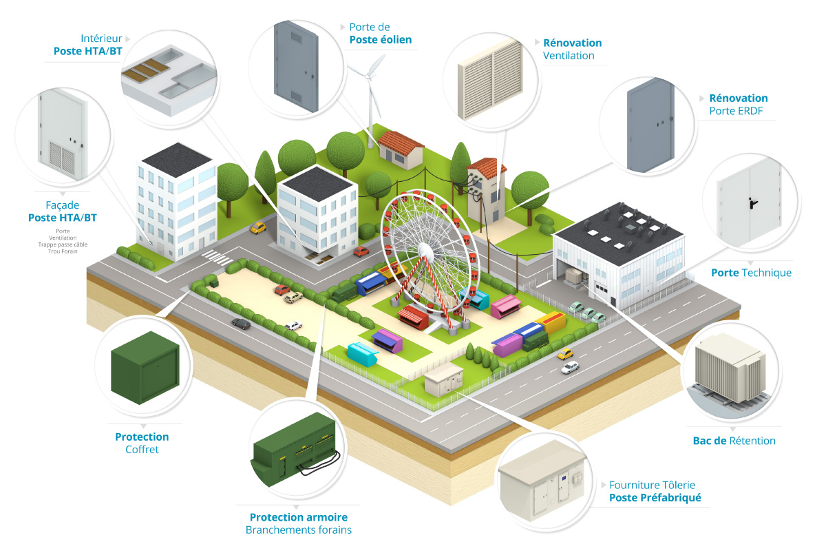 équipements complets pour postes de transformation et locaux transformateurs ;